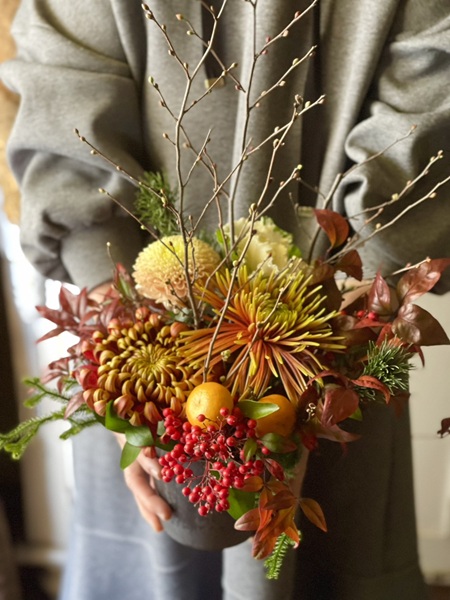 それぞれ実物や枝物、縁起物の葉物とあわせてお仕上げしております。