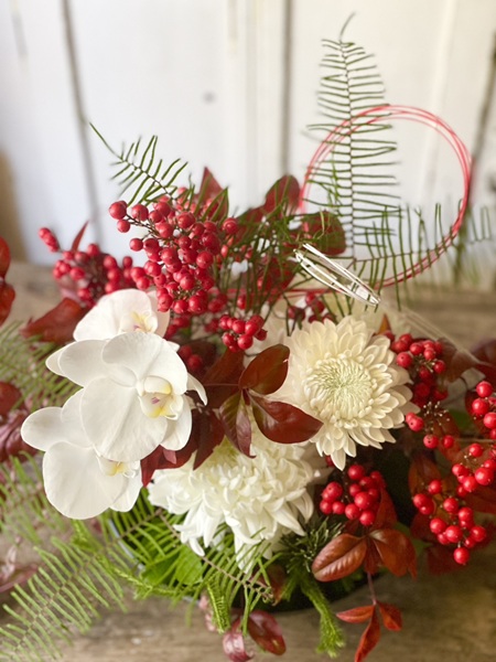 お正月紅白アレンジ 25-k06 お正月紅白アレンジ ミディサイズの純白の胡蝶蘭が美しい 紅白のアレンジメントです。 真っ白な大輪マムに、南天や葉物をあわせて スッキリした華やかさです。 幅約40センチ、高さ、奥行き約30センチ 送料についてはこちら 在庫有り ¥11,000(税込) 数量